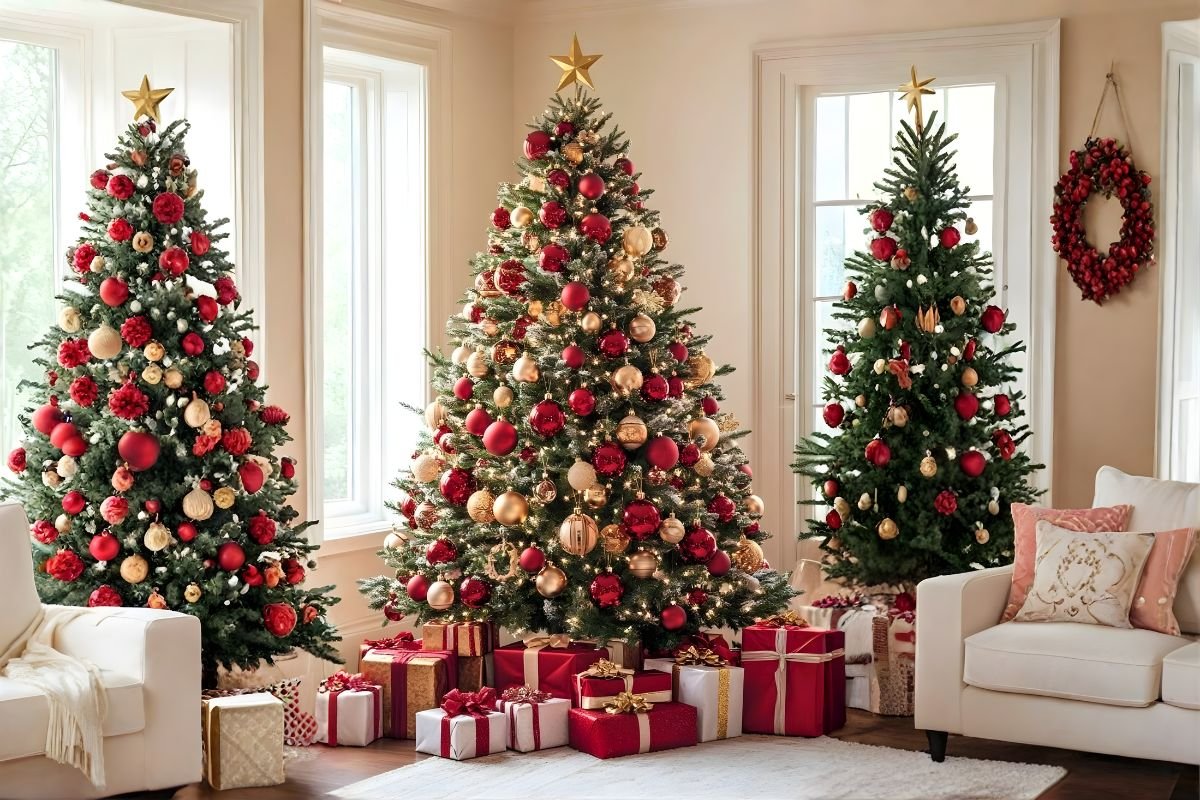Trong trường hợp bạn mong muốn phong cách sang trọng và rực rỡ nhất, bạn có thể tham khảo trang trí cây thông Noel bằng một gam màu ánh kim nổi bật là vàng hoặc đỏ.