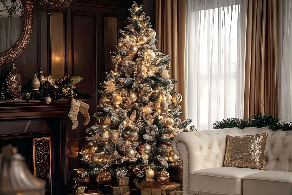 Trường hợp nhà sở hữu nội thất gam màu tối, thì cây thông màu vàng hay đỏ ánh kim mang lại sự ấm áp mà vẫn không kém phần sang trọng.