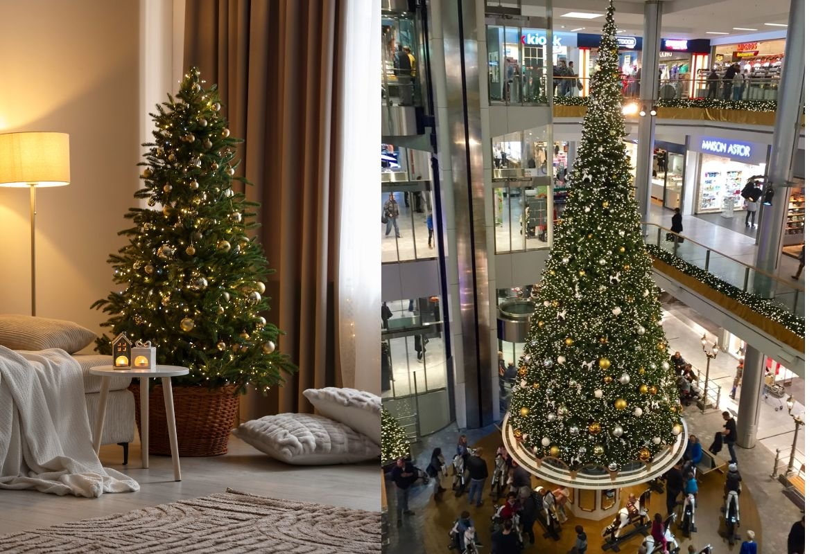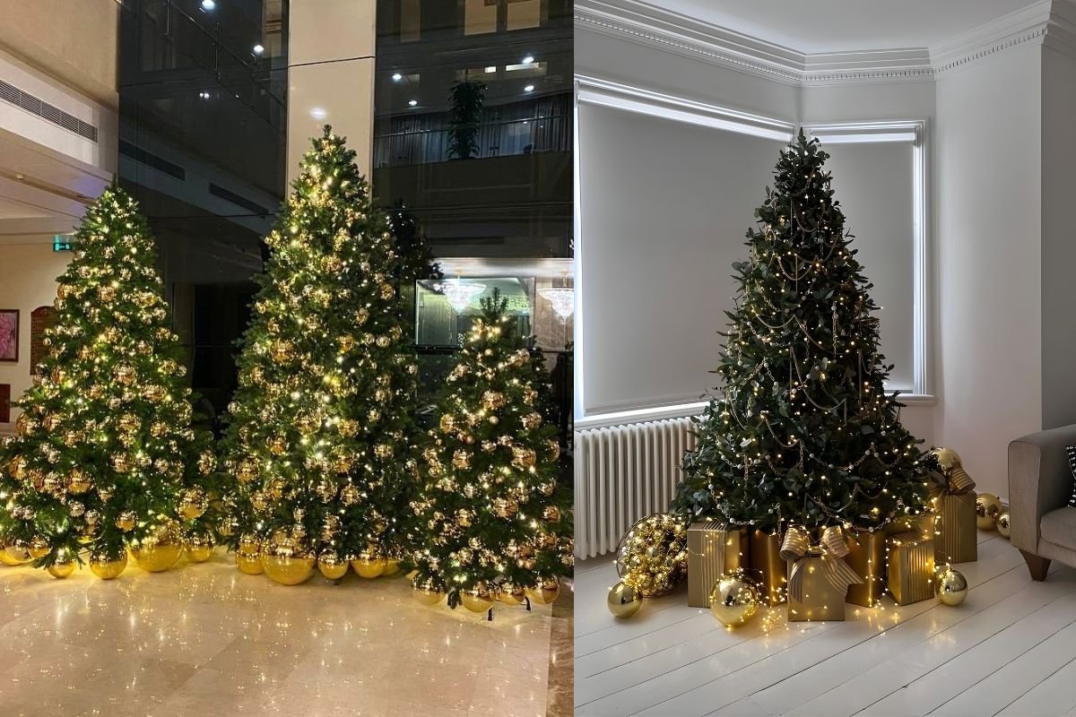 Chắc chắn sẽ khiến ai cũng phải trầm trồ ngước nhìn bởi độ hoành tráng. Sự kết hợp này sẽ vô cùng lý tưởng cho không gian rộng, sảnh hay phòng khách có diện tích lớn, từ đó tăng thêm độ lộng lẫy và biến cây thông trở thành tâm điểm.