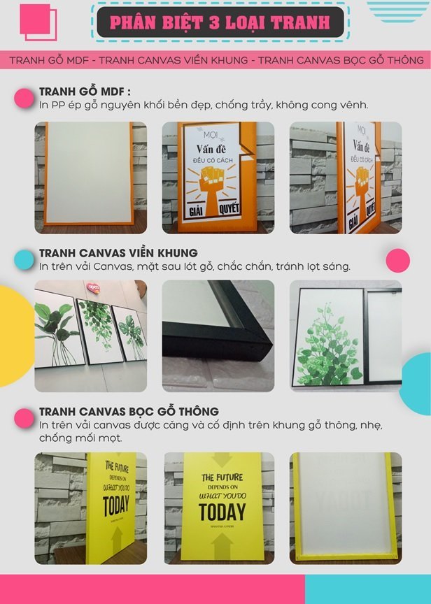 - Tranh Canvas viền khung cao cấp (chất liệu mới): Tranh Canvas được bổ sung lớp khung bên ngoài giúp tăng độ bền gấp 3 lần, giảm hư hại khi rơi vỡ, tranh được tích hợp thêm tấm gỗ mỏng giúp tranh được căng phẳng hơn, ngăn chặn ánh sáng xuyên qua tranh gây hiện tượng đổ bóng, tạo tranh có độ thẩm mỹ hoàn hảo, tinh tế.
